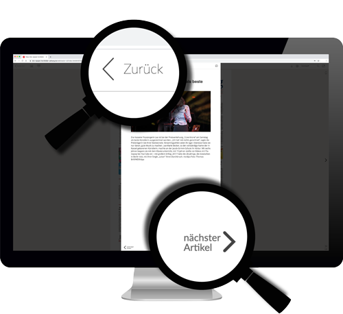 Durch Klicken auf einzelne Artikel öffnet sich die Artikelansicht. Über "Zurück" am oberen Ende der Artikelansicht kommen Sie zurück in die gewohnte Zeitungsansicht. Über die Pfeile am unteren Ende der Artikelansicht können Sie in den nächsten Artikel wechseln ohne die Artikelansicht zu verlassen.