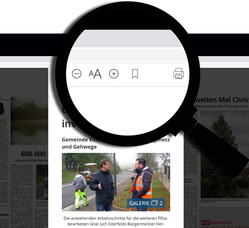 Innerhalb der Artikelansicht können Sie über die Regler die Schriftgröße nach Ihren Wünschen ändern und den ausgewählten Artikel drucken.
